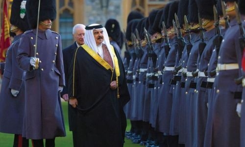 His Majesty King Hamad bin Isa Al Khalifa met with His Majesty King Charles III of the United Kingdom at Windsor Castle as part of his visit to the UK. Upon arriving at Windsor Castle in the royal carriage, HM the King was received by HM King Charles III with an official welcome, including the playing of the Bahraini national anthem.