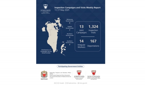 The Labour Market Regulatory Authority (LMRA) has announced the results of a major inspection campaign carried out across Bahrain between May 11 and May 17, 2025, which led to the deportation of 167 violators and the detention of 14 irregular workers.