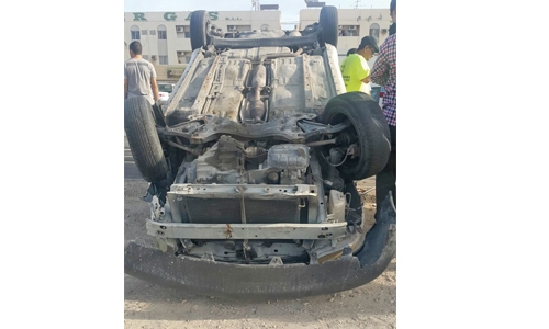 Manama : Two people sustained injuries when their car turned turtle near Khamis Police Station yesterday.