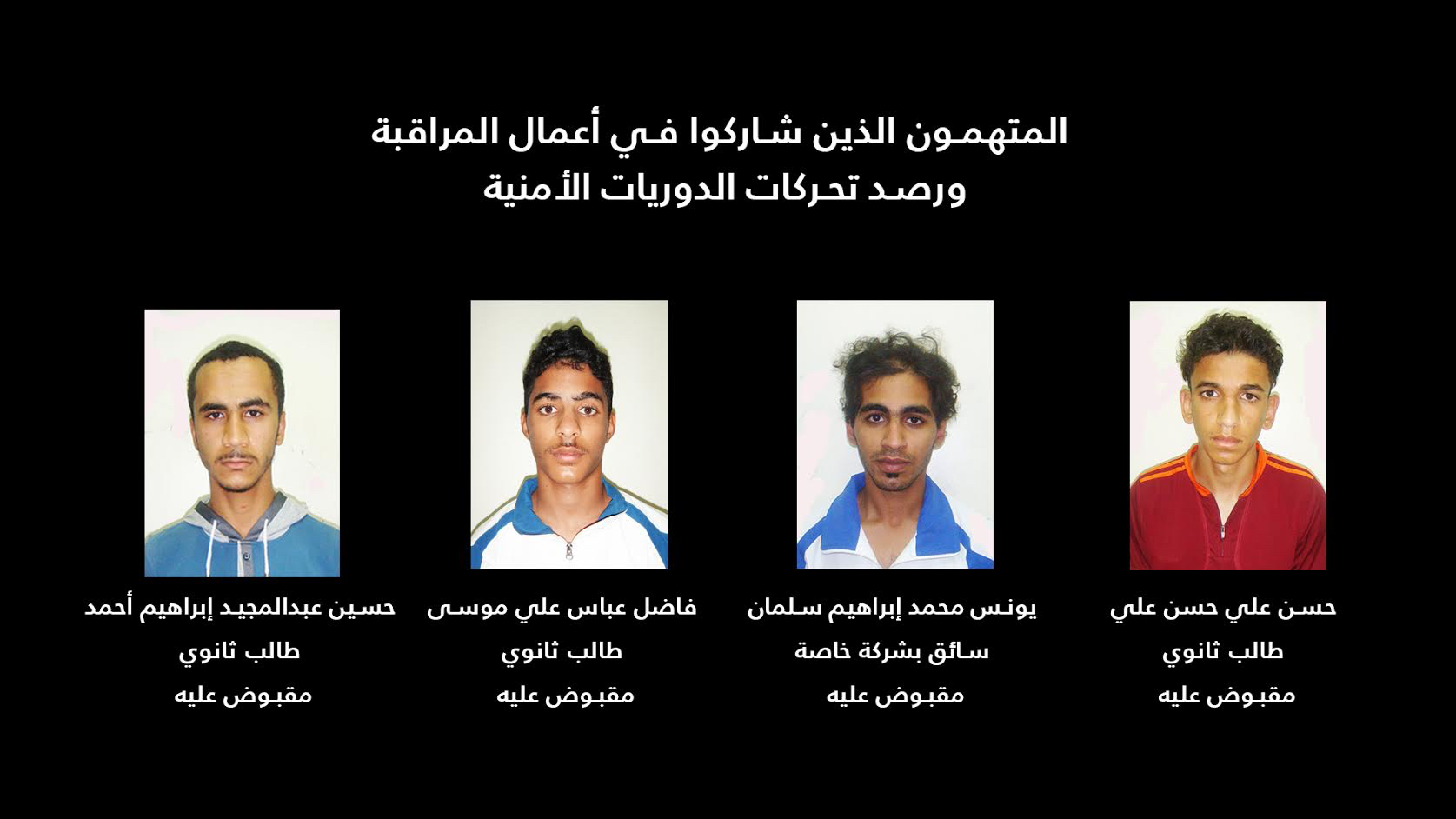 The suspects who were involved in monitoring of security patrols (from left) Hussain Abdulmajeed Ibrahim Ahmed (secondary school student (arrested)), Fadhel Abas Ali Musa (secondary school student (arrested)), Younis Mohammed Ibrahim Salman (driver at a private company (arrested)) and Hassan Ali Hassan Ali (secondary school student (arrested)).