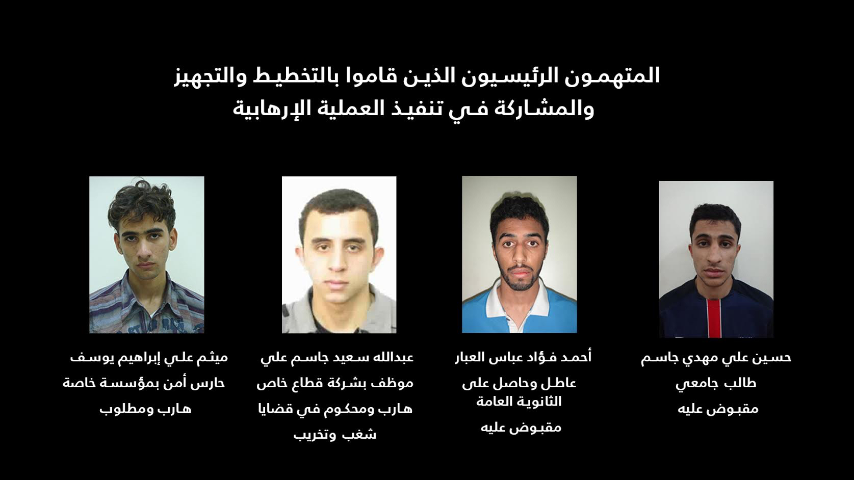 The main suspects who plotted, prepared and were involved in the crime (from left) Maitham Ali Ibrahim Yousif (security guard at a private company (fugitive)), Abdullah Saeed Jassim Ali (employee at a private company (fugitive and sentenced in other rioting and vandalism cases)), Ahmed Fuad Abas Al Abar (unemployed secondary graduate (arrested)) and Hussain Ali Mahdi Jassim (university student (arrested)).