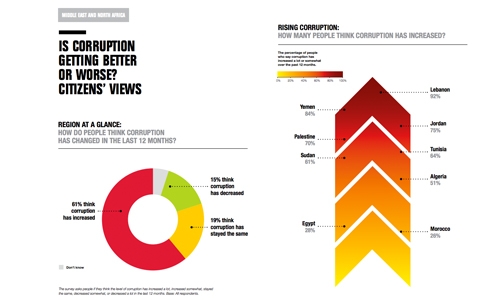 Across the MENA region the problem of corruption is widely seen to be on the rise. A majority of people, 61pc, say that they think corruption increased in the 12 months before the survey was conducted. Only 15pc say they think it decreased, while a further 19pc say that they think it stayed the same, according to the survey.