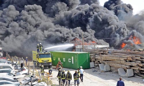 Manama : More than 60 firefighters and 20 civil defence vehicles engaged in putting out a massive fire that erupted in a vehicle scrapyard in South Alba in Riffa yesterday. Deputy General Director of Civil Defence said the fire was reported at 1.41pm and the teams reached within six minutes. He informed that no injuries were reported, adding that an investigation is underway to find out the cause of the blaze.
