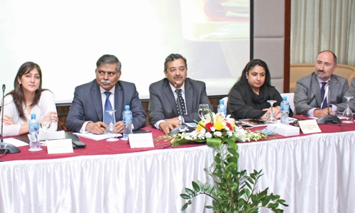 Indian Ambassador Alok Kumar Sinha, Ministry of Foreign Affairs (MoFA)’s Assistant Under-Secretary for Arab & Afro-Asian Affairs and Organisations Dr. Sheikha Rana bint Isa bin Daij Alkhalifa, Bahraini and Indian businessmen, representatives from Invest India and Economic Development Board (EDB) and other invited guests took part in the discussion which was held at Diplomat Radisson Blu Hotel yesterday morning.