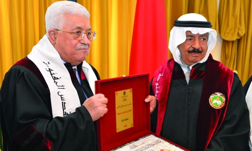 Manama : The Al-Quds Open University (QOU) has conferred honorary doctorate on His Royal Highness Prime Minister Prince Khalifa bin Salman in recognition of his humanitarian and development stances and in tribute for his advocacy of Arab and Islamic issues and unlimited support for the Palestinian people.
