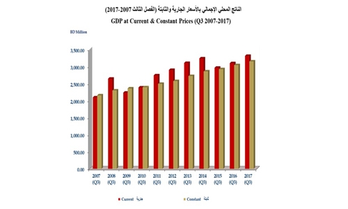 The report clarified that the results of the third quarter of 2017 compared to the second quarter of the same year indicates that the economic grew by 1.6 per cent in constant prices and by 2.2 per cent in current prices. The oil sector recorded a rise of 3.3 per cent in constant prices and 6.4 per cent in current prices. Non-oil sector increased by 1.2 per cent and 1.6 per cent, respectively, at constant and current prices.