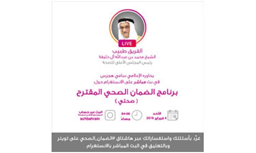 Manama : Supreme Council for Health (SCH) President Lieutenant-General Dr. Shaikh Mohammed bin Abdulla Al-Khalifa will communicate directly with the public today, from 04:00 PM, via Instagram feature InstaLive. The SCH said that the focus would be on the health insurance scheme which is stirring debate on social media, adding that some inaccurate information posted online require clarification.