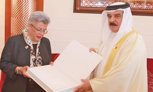 Manama : His Majesty King Hamad bin Isa Al Khalifa yesterday stressed Bahrain’s resolve to protect human rights, backing all efforts made in this regard. “The Kingdom is fully committed to international law and conventions related to human rights which are an integral part of Bahrain’s culture, inherent Arab identity, Islamic faith and noble values of tolerance, co-existence, pluralism and acceptance of the other,” His Majesty said while receiving the Board of Commissioners Chairwoman of the National Institution for Human Rights (NIHR) Maria Khoury and members at Safriya Palace yesterday.