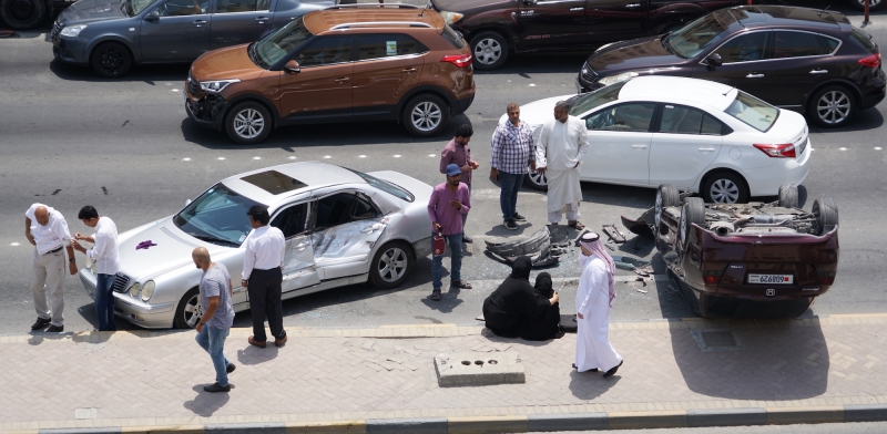 A three-way car accident took place this morning at 10:30am. The accident happened on the road opposite Al-Kindi Hospital. It involved two male drivers and a female driver, whose Honda overturned, damaging the car completely. Miraculously, the woman behind the wheel of the flipped car, was able to be pulled out, without any visible injuries. One of the male drivers, whose car was severely hit on one side seemed to have an arm injury and both were taken for observation and medical assistance by an ambulance. Civil Defence arrived quick on the scene and took control of the situation.
