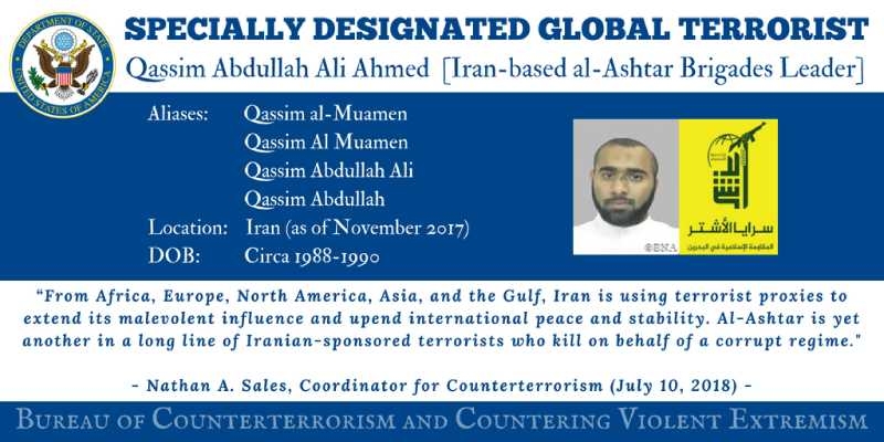 The US State Department has designated Qassim Abdullah Ali Ahmed aka Qassim Al Muamen, as a Specially Designated Global Terrorist (SDGT), said a release issued by the US embassy in Manama yesterday.