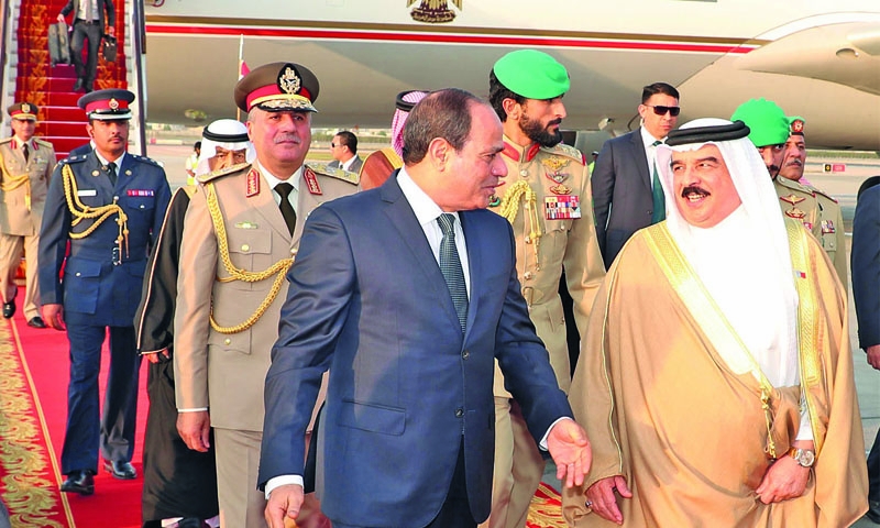 Manama : Egypt President Abdul Fatah Al-Sisi who arrived on an official visit to the Kingdom yesterday held talks with His Majesty King Hamad bin Isa Al Khalifa to boost bilateral relations at various levels in the interest of the two countries and their people. The talks were held in the presence of His Royal Highness Prime Minister Prince Khalifa bin Salman Al Khalifa and delegations of both countries. Regional and international developments and topics of joint interests were reviewed, in addition to pushing on with efforts to combat terrorism and its forms of financing to establish peace, security and stability in the region.