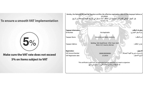 “To ensure a smooth implementation of VAT, make sure that VAT rate does not exceed 5pc on items subjected to VAT,” the National Bureau of Taxation stated. It also urged customers to be vigilant. “Make sure VAT is not applied on items not subjected to the tax. To find the list of items not subjected to VAT, please visit our website www. nbt.gov.bh,” it highlighted. “To report any violations or complaints regarding the implementation of VAT, please call consumer protection on 80008001,” the NBT said, adding that consumers do not need to register for VAT.