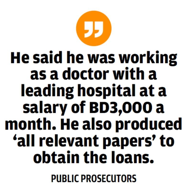Public Prosecutors said that the accused approached the bank’s manager and requested him for a loan to buy a Land Cruiser. “He said he was working as a doctor with a leading hospital at a salary of BD3,000 a month. He also produced ‘all relevant papers to obtain the loans’.”