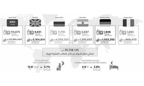 Visitors included business and project owners. BTEA said it collaborated with 150 Saudi travel agencies during the period. UK ranked second with 9,831 tourists arriving and contributing BD 5,164,814 to the national economy. UK representative office, BTEA said, succeeded in establishing partnerships with 10 of the most prominent agencies there including Expedia, Southall Travel, Travelbag and Lastminute. com. Closely following the UK was Russia with 7,719 travellers spending BD 4,055,253 million.