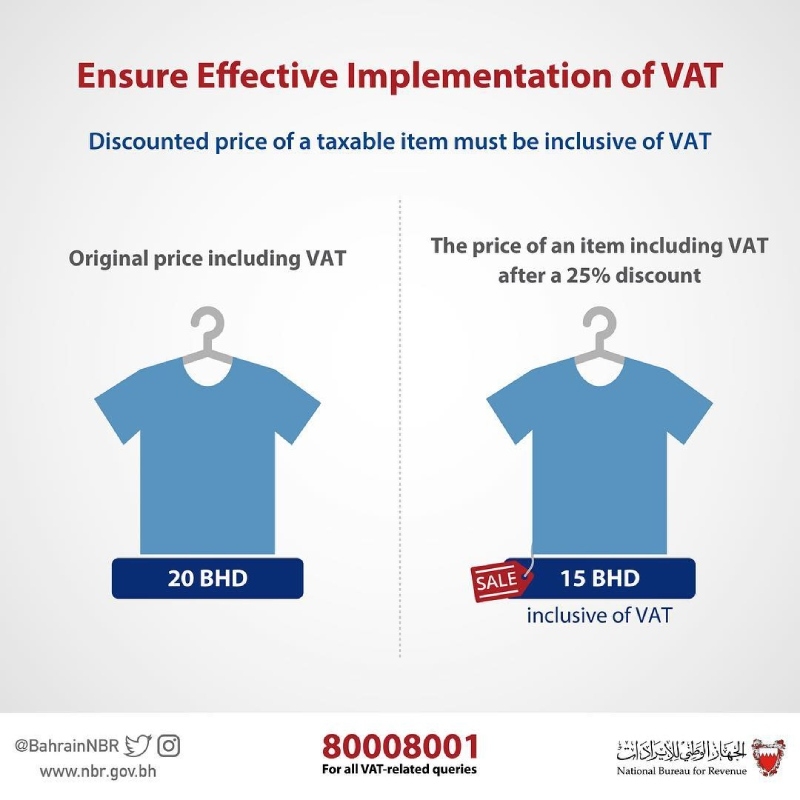 If the original price of a taxable item is 20 BD, following a 25% discount, the item will be 15 BD inclusive of Value Added Tax.