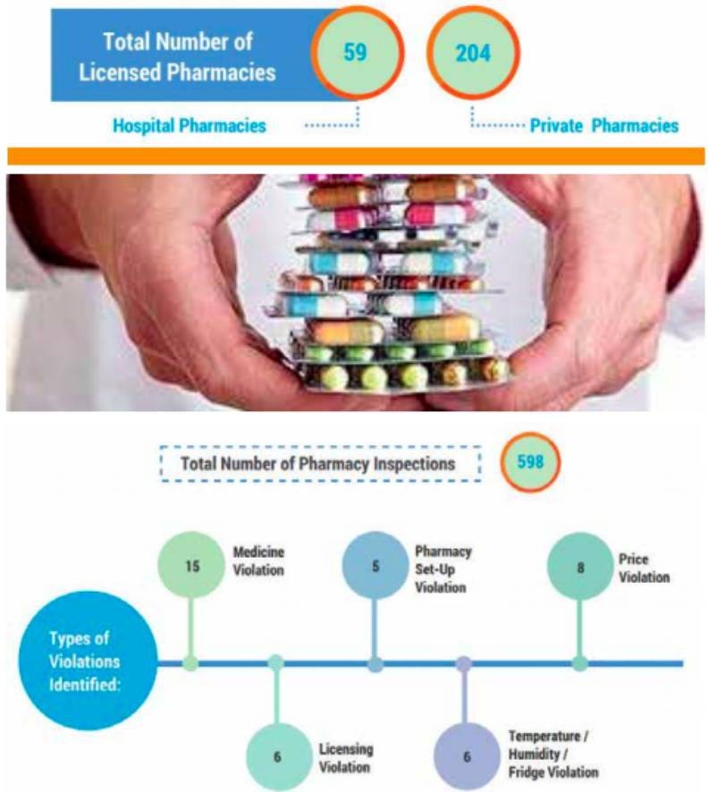 The authority spotted 15 of them. Altogether NHRA spotted five types of violations which were recurring. The second most detected violation was related to Pricing. NHRA found eight during visits. Others are pharmacy set up violations (5), licensing violations (6) and temperature/humidity/ fridge violation (6).
