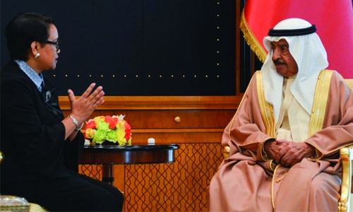 His Royal Highness Prince Khalifa bin Salman Al Khalifa the Prime Minister received Indonesia’s Foreign Affairs Minister Retno Marsudi, currently on an official visit to the Kingdom, yesterday. HRH the Premier welcomed the Indonesian Foreign Minister and reaffirmed the importance of mutual visit between officials in both countries to consolidate the co-operation as well as consultation and co-ordination on various regional and international issues.