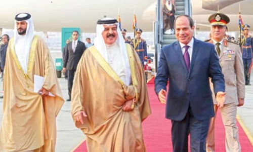 The Egyptian President hailed the pioneering efforts of HM the King in bolstering bilateral relations, describing those relations as a distinguished model of co-operation between brotherly countries. His Majesty praised Bahrain’s honourable role, spearheaded by HM the King, in supporting pan-Arab work. HM the King also lauded HM the King’s wise stances regarding regional issues, stressing Egypt’s unwavering stance concerning security of the Arabian Gulf, being an integral part of Egypt’s national security. Both leaders discussed regional and international developments as well as issues of common concern.