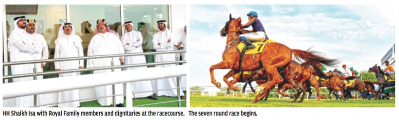 HH Shaikh Isa bin Salman bin Hamad Al Khalifa presented the trophy of for Safra Cup for Ara- bian horses to winner trainer Abdulla Kuwaiti.
