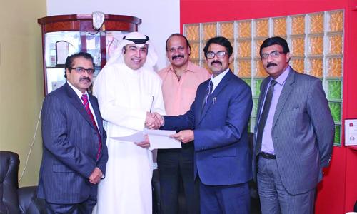 4pm News, the first evening daily from the Middle East, signed an MoU with Regional Atlantic Group (RAC), Kuwait, for printing and publishing the newspaper from the State of Kuwait. Ahmad Al Omar, Chairman, RAC, (2nd from left) hands over the agreement to P.Unnikrishnan, Chairman & MD 4PM News (2nd from right) with Soman Baby, Director, 4PM News (left), S. Jayakumar, Managing Director (RAC) & CEO Kuwait Operations (centre) and Boban Idiculla, Director, 4PM News (right) during the MOU signing ceremony held at SPAC office in Bahrain yesterday.