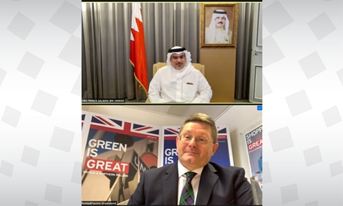 His Royal Highness Prince Salman bin Hamad Al Khalifa, the Crown Prince and Prime Minister, today held a remote meeting with HE Roderick Drummond, Ambassador of the United Kingdom to the Kingdom of Bahrain