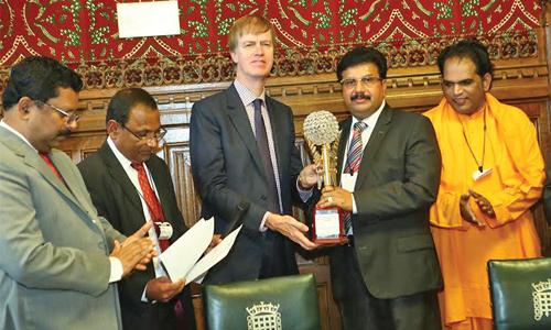 Former British Minister Stephen Timms presents an award to VKL Holdings and Al Namal group of Companies Chairman Dr. Varghese Kurian in recognition of vari- ous humanitarian projects he has undertaken. The ceremony was held at the British Parliament, UK and organised by the British MP of Indian Origin Virender Sharma in the presence of Santhigiri Asramam Organising Secretary Swami Gururatnam Jnanathapassi and Kerala chief secretary Jiji Thomson.