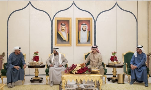 His Majesty King Hamad bin Isa Al Khalifa received at his residence yesterday Abu Dhabi Crown Prince and Deputy Supreme Commander of the UAE Armed Forces, HH Shaikh Mohammed bin Zayed Al Nahyan, Ruler’s Representative in Al Dhafra Region, HH Shaikh Hamdan bin Zayed Al Nahyan, and Ruler’s Representative in Al Ain Region, HH Shaikh Tahnoon bin Mohammed Al Nahyan.
