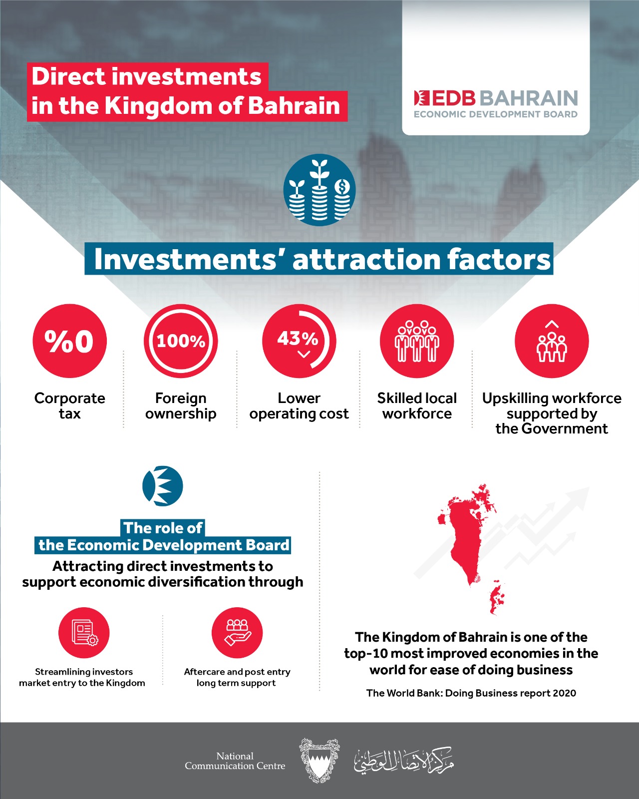 EDB focuses its plans on eight vital economic sectors by promoting their opportunities and promising areas to gain the interest of qualitative investments, providing the best investment solutions in a way that achieves developmental sustainability. The characteristic of the Bahraini economy is that it is diversified and flexible, it added.