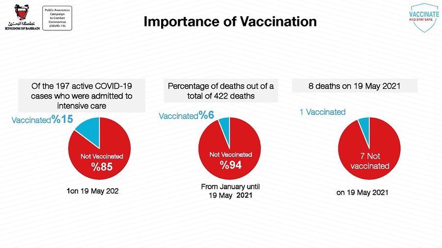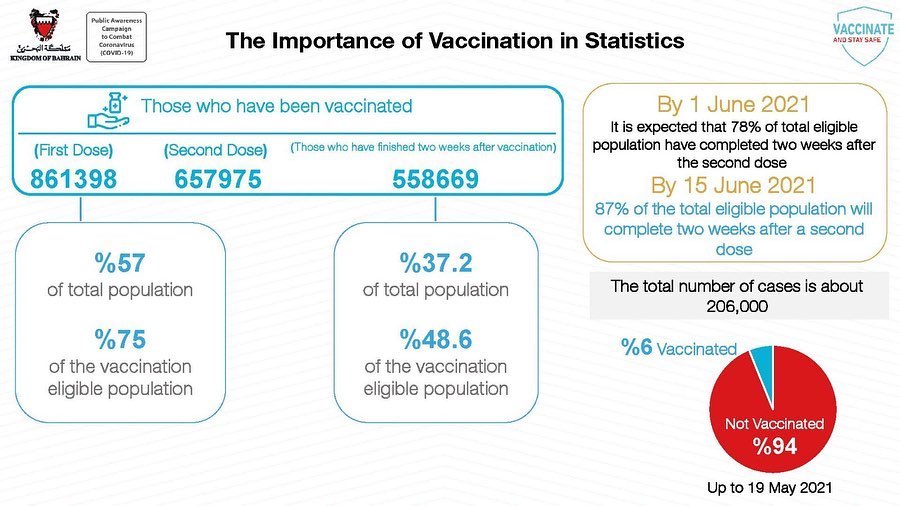 Al Qahtani said that 75% of the people eligible for vaccination had received their first dose or 57% of the total population. Vaccinated group mortality at 6% When asked about the mortality rate, Al Qahtani said that 6% of 422 deaths, recorded from January to 19 May 2021, were among those who took both jabs.