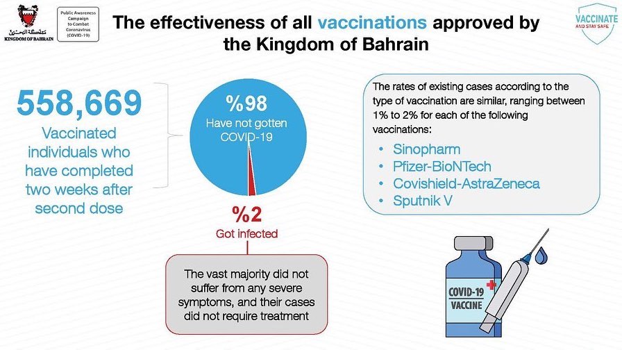All the Covid-19 jabs available in Bahain are effective against the COVID-19 virus and its mutations, Lt. Col. Dr Manaf Al Qahtani said.