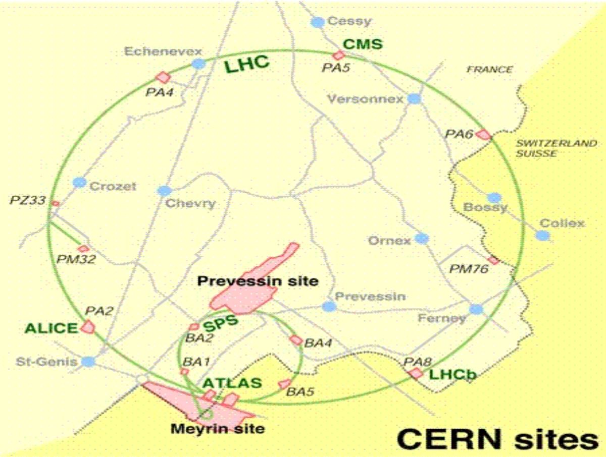 It has a diameter of about 27 kilometres, and it is built underground at a depth of about 100 metres between France and Switzerland near Geneva.