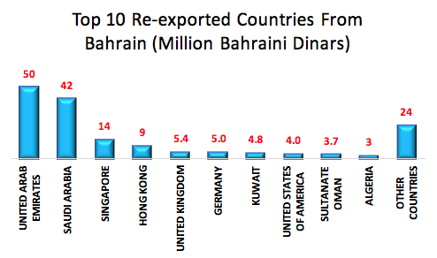 Bahrain also re-exported BD19 m worth of gold ingots and BD14m worth parts of aircraft engines. Quarterly re-exports rose by 15% to BD164m from BD143m in the year-ago quarter.