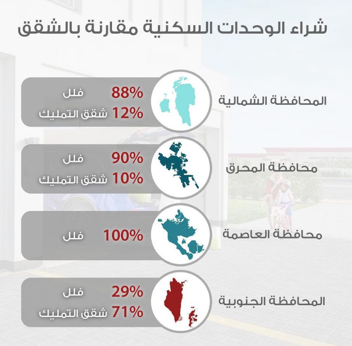 Housing units account for 88% of the total sales in the Northern Governorate, where the remaining 12% accounts for ownership apartments. In the Muharraq Governorate, villas account for 90% of the total sales and apartments the remaining 10%.