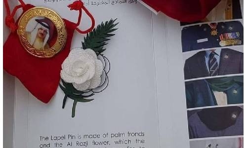 The white Razji flower and the green palm frond pin is Bahraini icon that honours the heroes who have sacrificed their lives in the service of the nation. It commemorates their selfless sense of sacrifice.