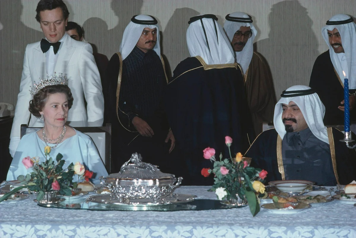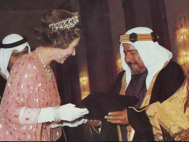 Queen Elizabeth ll and Isa bin Salman Al Khalifa (1933-1999), the Emir of Bahrain, exchanged gifts at the Gudaibiya Palace, as part of the Queen’s tour of the Gulf States in 1979 (credits: Albawaba)