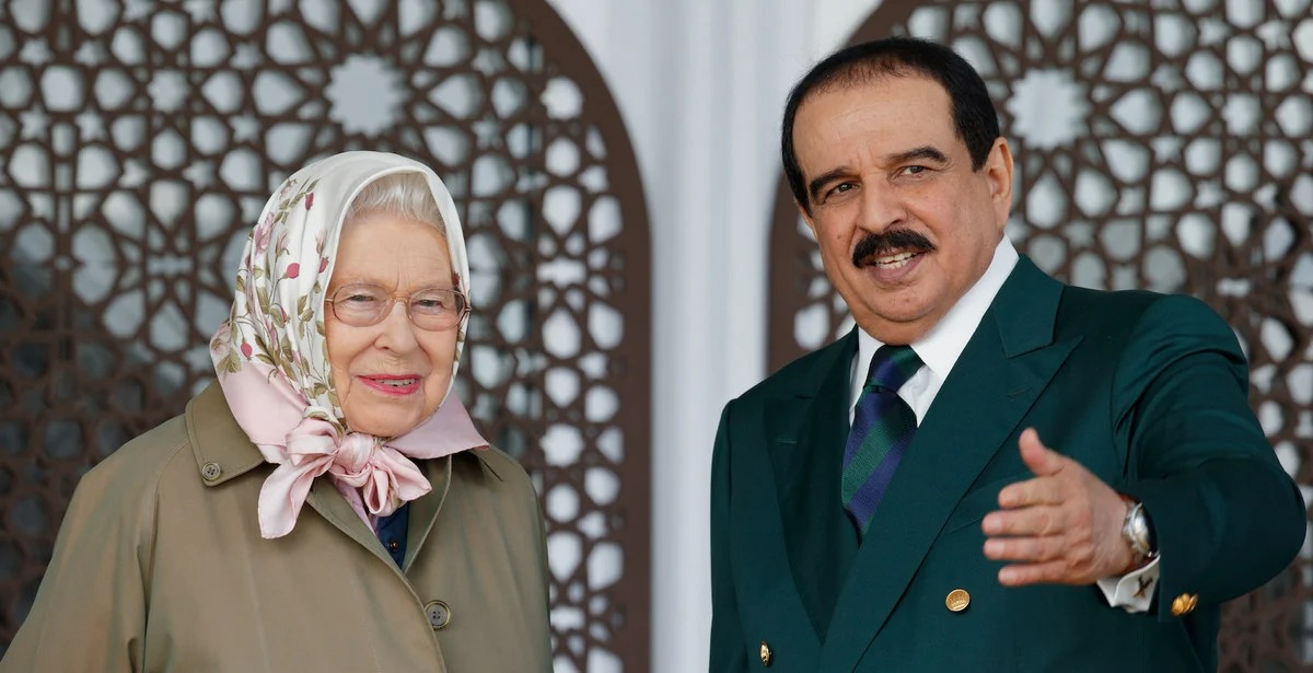 Queen Elizabeth II with Isa bin Salman Al Khalifa (L), the Emir of Bahrain and HM King Hamad bin Isa Al Khalifa (R)