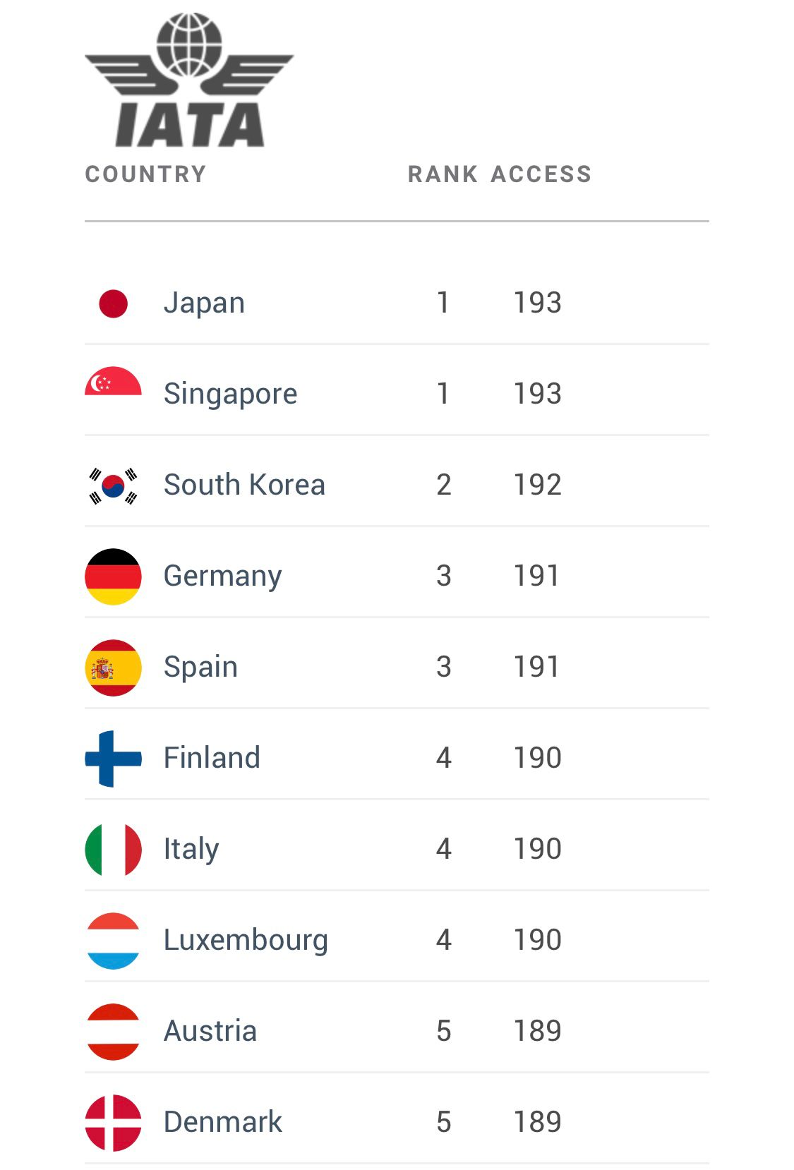 According to the Henley & Partners, Global Ranking Index, Japan and Singapore tie for first place (193 destinations), South Korea is second (192 destinations), and Germany and Spain are third (191 destinations).