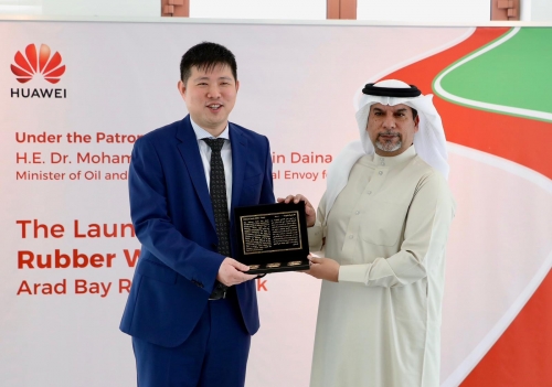 The rubber walkway in Dohat Arad, Muharraq was officially opened yesterday by Huawei CEO Mr Aziz Tang and Oil and Environment Minister Dr Mohamed Bin Mubarak Bin Dainah.