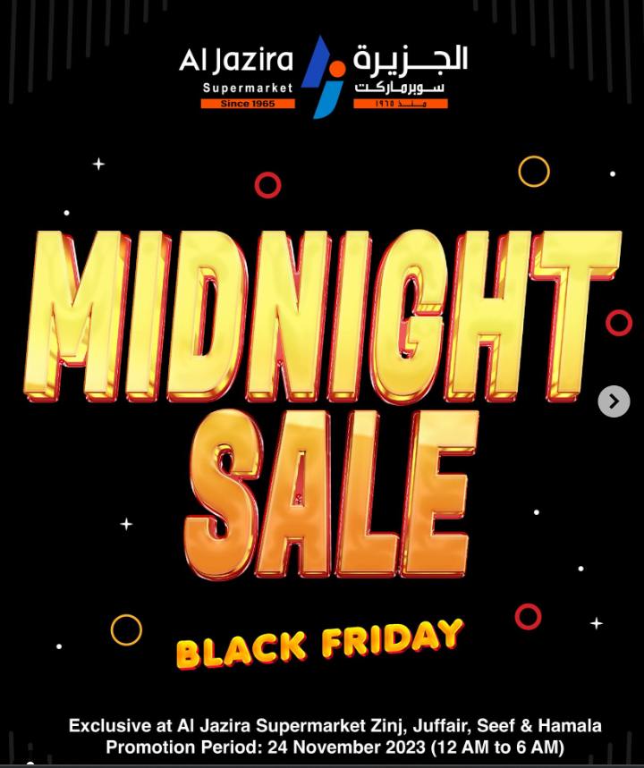 Al Jazira Black Friday Midnight Sale is available at its outlets at Zinj, Seef, Juffair, and Hamala.