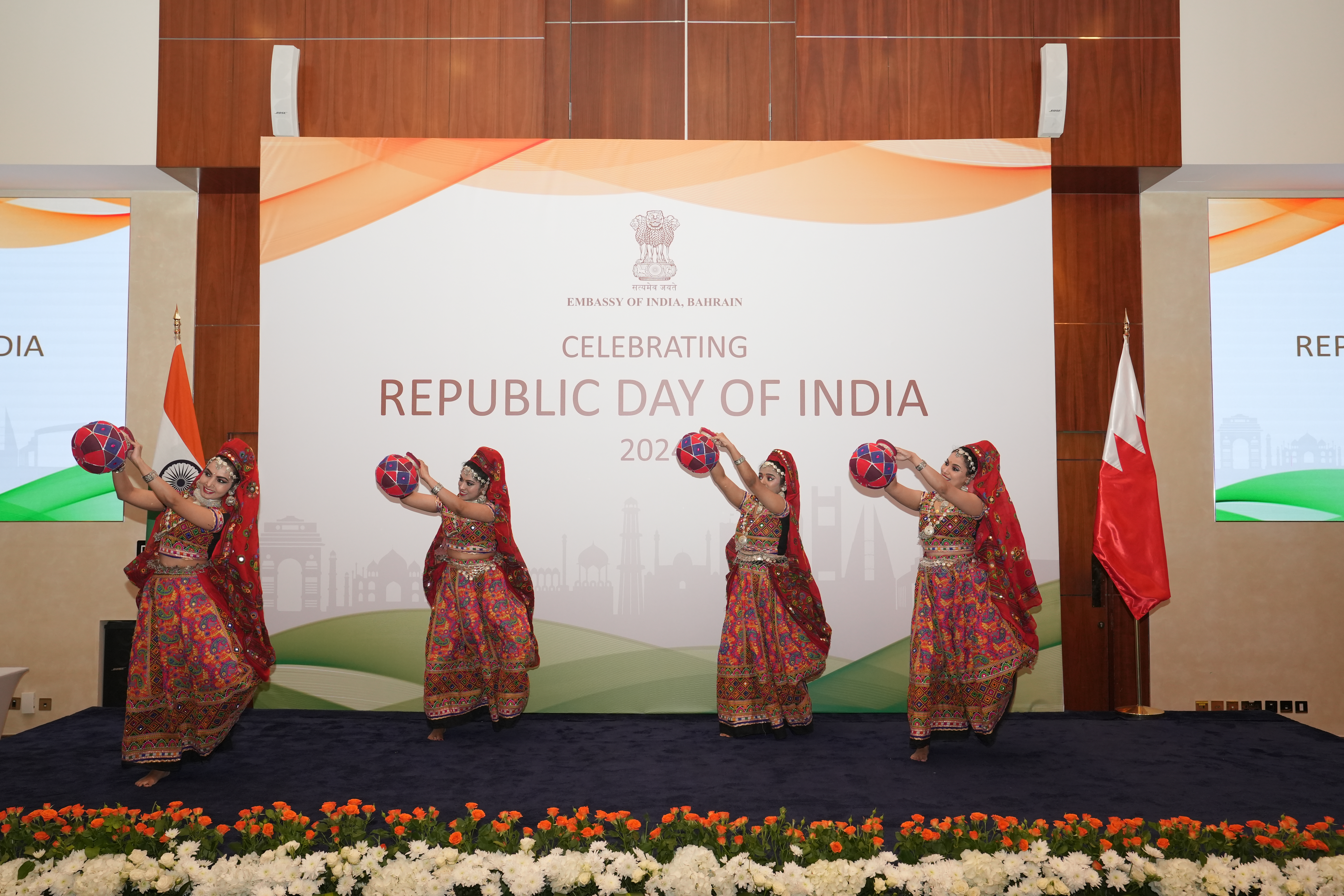 This event was also attended by the heads of several diplomatic missions in Bahrain, senior Bahrain government officials, and prominent members of the Indian and Bahraini communities. They were entertained by traditional dance and music performances, including the Garba dance, marking the inclusion of the art form in UNESCO’s Representative List of Intangible Cultural Heritage of Humanity. The Bahrain Interior Ministry's band played the National Anthems of India and Bahrain.