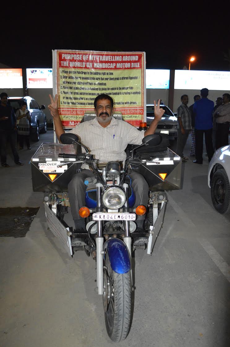 B.V Narayana, a 55-year-old Bengaluru-based professional vehicle-modifier for the handicapped people, who himself met with an accident and became partial handicapped, reached Bahrain as part of his world tour.