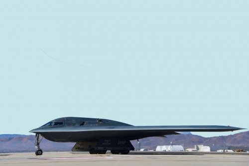 A B-2 Stealth Bomber pulls up on the runway after landing at the Palmdale Aircraft Integration Center of Excellence in Palmdale, California on July 17, 2014, where the US Air Force and manufacturer of the B-2, Northrop Grumman, celebrated the 25th anniversary of the B-2 Stealth Bomber’s first flight.