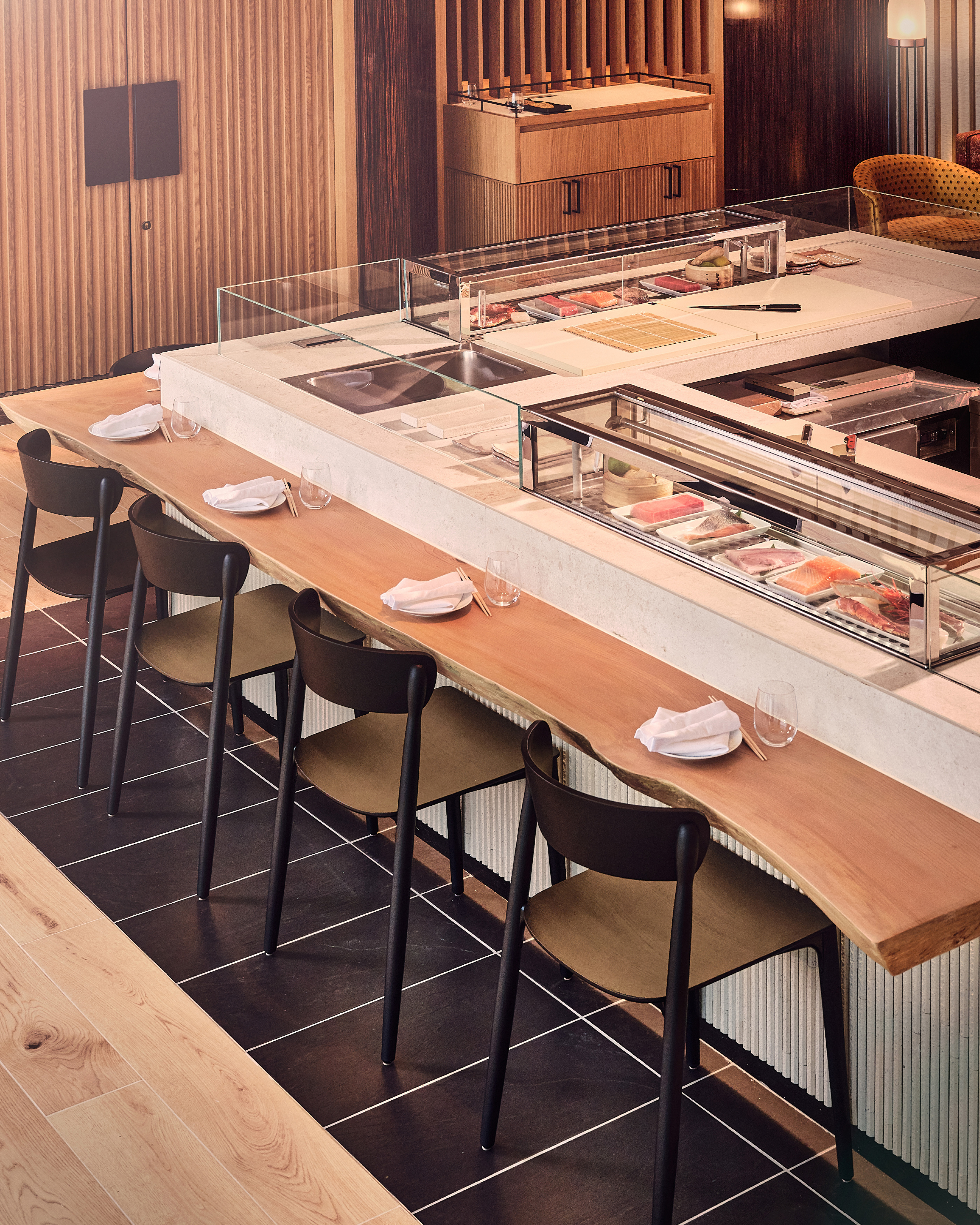 Playing to a neutral palette of warm earthy tones, the setting reflects the minimalist Japanese aesthetic and allows the true stars to shine: the expert chefs behind the raw-edge wooden sushi counter creating vibrant box-pressed oshizushi sushi to order.
