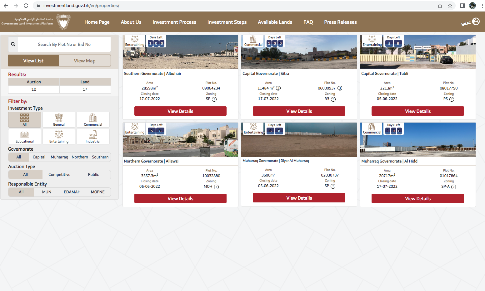 Public auctions of the plots will be through the Bahrain Tender Board. The Minister of Works, Municipalities Affairs, and Urban Planning, Essam bin Abdulla Khalaf, said the new “Land Investment Platform” will play a key role in strengthening public and private sector partnerships and promoting transparency.