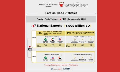 The Information &eGovernment Authority (iGA) has released its Foreign Trade report of 2023, which encompasses data on Trade Balance, Imports, Exports of products with national origin, and Re-exports.