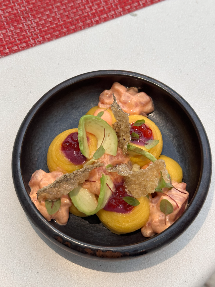 The multiple textures of plump and juicy shrimp, crispy plantain chips, and smooth and creamy potato puree were stunning! This was followed by ‘hot ceviche’ with sea bass and shrimp, and as the name suggests, the dish has a spicy kick owing to the use of a sauce prepared from unique yellow chilli, aka aji amarillo, grown in Peru.
