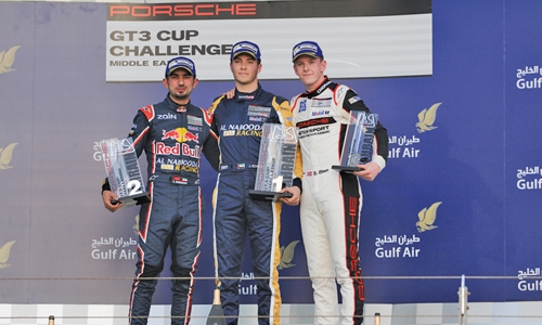 Manama : Jeffrey Schmidt of the UAE driving for Al Nabooda Racing in a time 20 minutes 54.518 seconds won race one yesterday in the Porsche GT3 Cup Challenge Middle East as an exhibition support race to the Gulf Air Grand Prix at the Bahrain International Circuit (BIC) in Sakhir.