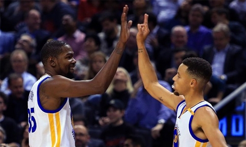 San Francisco : Stephen Curry and Kevin Durant each scored 25 points apiece as the Golden State Warriors overturned a fourth quarter deficit to defeat the Atlanta Hawks 105-100 and claim a 12th straight victory on Monday.