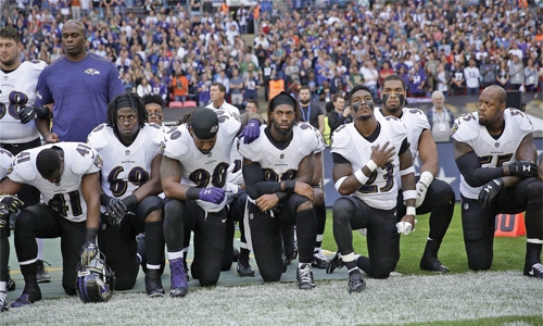 The protests began last year when quarterback Colin Kaepernick of the San Francisco 49ers refused to stand for the anthem to protest racial injustice and police brutality.