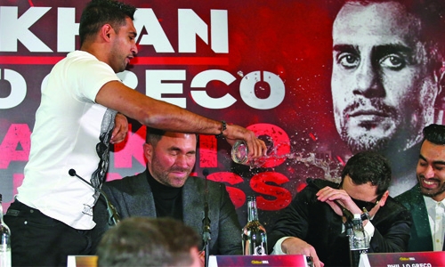 London : Amir Khan threw water over opponent Phil Lo Greco yesterday reacting to talk about his personal life.